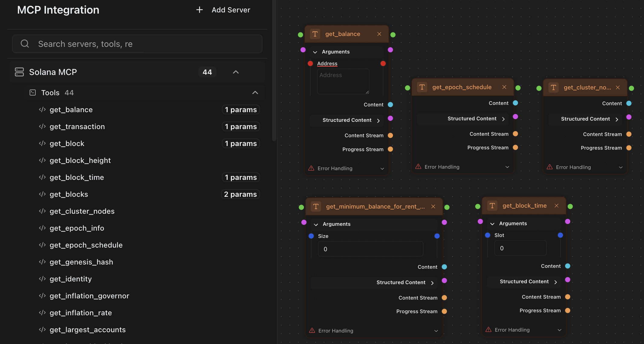 Connected MCP servers expose their available tools through ChainGraph's dynamic tool calling system, which automatically generates properly typed input schemas and handles complex parameter validation. The framework supports mutable output schemas that adapt based on tool definitions, enabling workflows to work with diverse data structures returned by different tools. Real-time progress streaming provides immediate feedback during long-running tool operations, with comprehensive error handling that captures and propagates detailed failure information for debugging and monitoring purposes.