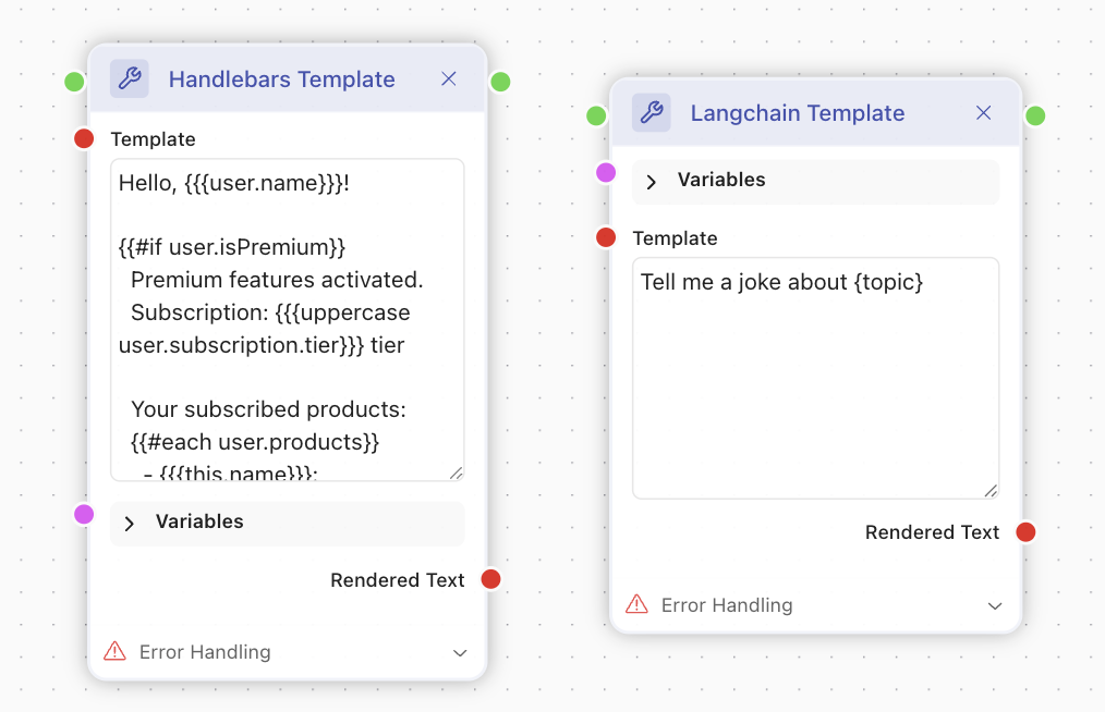 Templates allow you to put variable values into a text, and they are widely used for Prompt assembling. There are two template nodes in ChainGraph: Handlebars and Langchain. Syntax-wise, Handlebars is more functional and better documented.