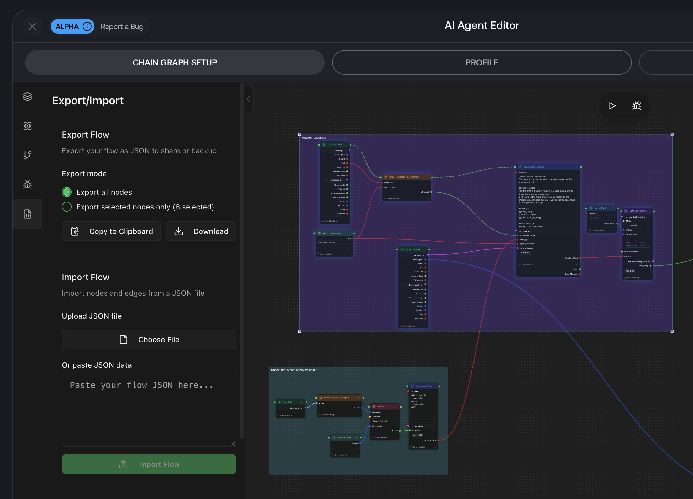 Regardless of how you choose to export your chaingraph, it will have all nodes, data, ports and connections similar to the original one.