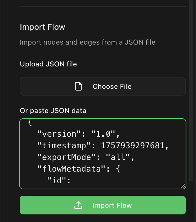 To import a flow, you should either have it copied to your clipboard or a downloaded file. Use a button "Choose file" or simply paste JSON data to the input field and press "Import Flow.