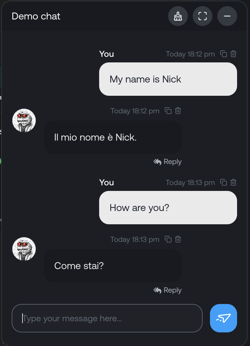 The demo chat window has controls at the top. So you can clean it (in case you want to start clean and get rid of context), expand to a fullscreen size with support for all interactive chat elements, or hide it.