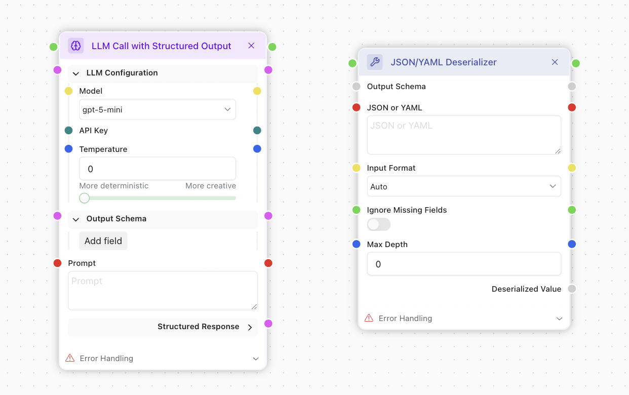 There are nodes that accept Schemas in their inputs. Good examples are LLM Call with Structured Output and JSON/YAML Deserialiser.