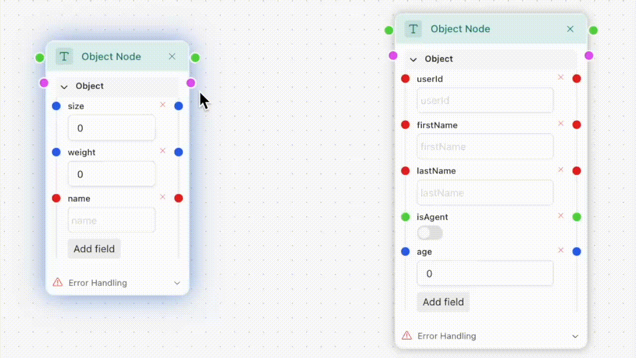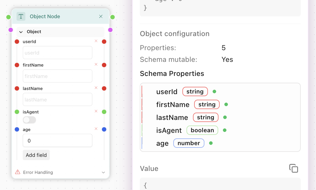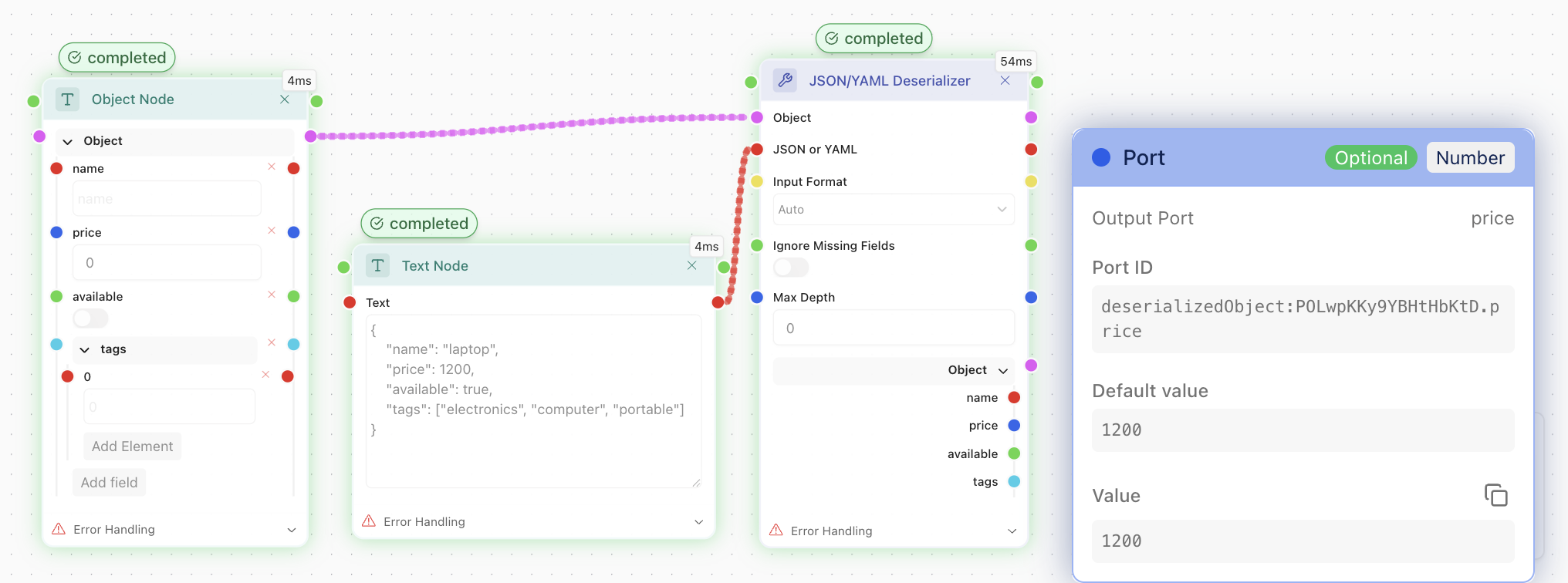 In the flow above, we've supplied the JSON/YAML Deserialiser node with our JSON and its Schema in a form of the object at the left. For every attribute, a port was created in the output object of the Deserialiser, so we are free to use the particular values now.