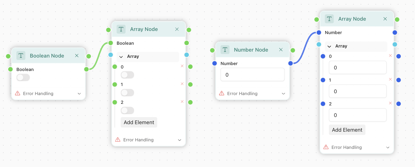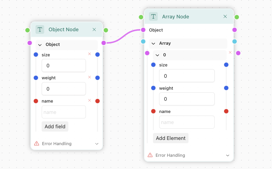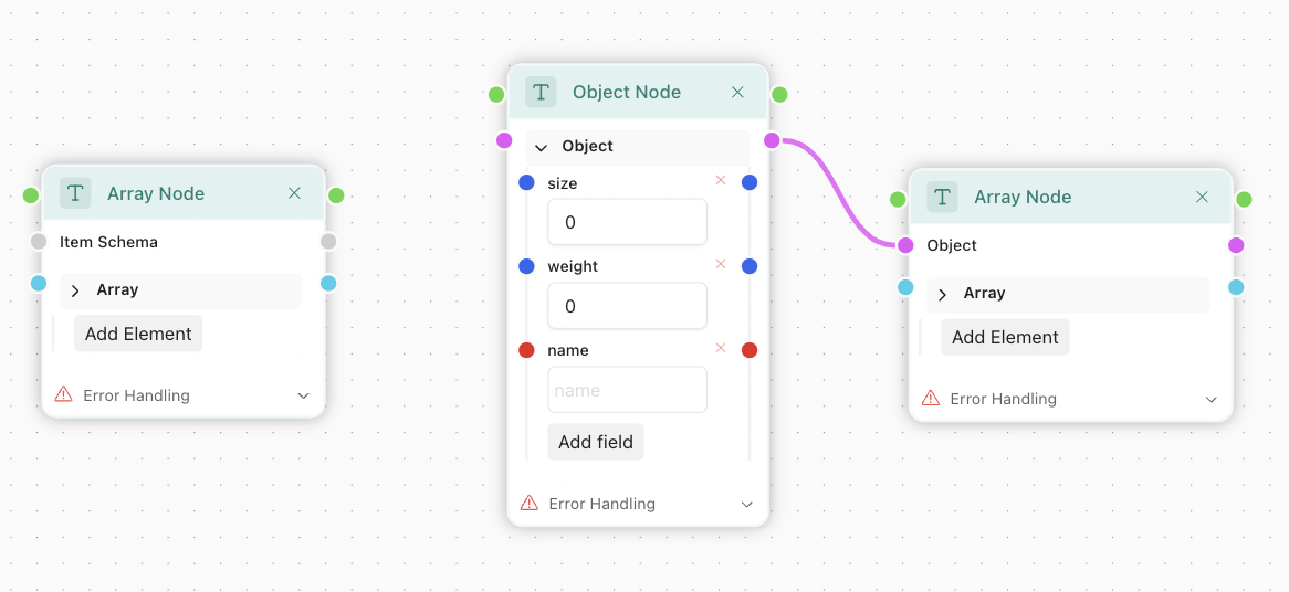 Every array has a schema for its element. Like with objects, it may be empty, allowing any element to be in, but it's not a best practice. At the left you can see Array node, it accepts Item Schema as input, so you can use any type as item. The most interesting use-case is to connect an object to it, which allows you to declare an array of objects: