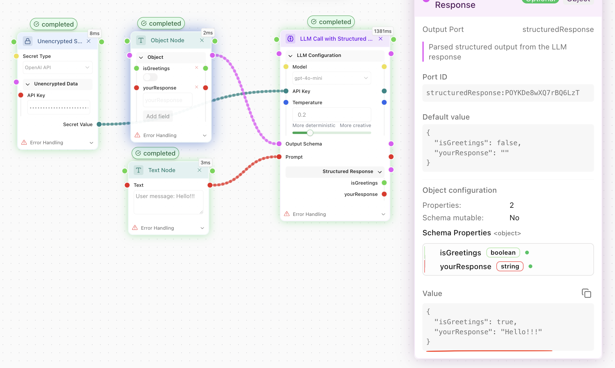 It was used as the response Schema, and the LLM filled it correctly without any explanations in the Prompt. You can now use the Boolean isGreetings port for the flow-control.md, for example.